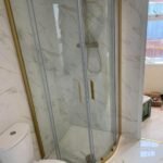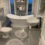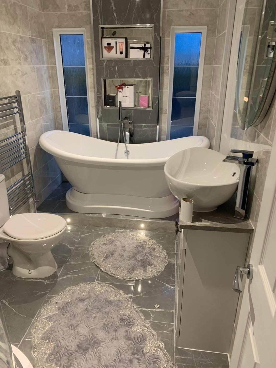 Large dining area with hall way leads to the main bathroom which is fitted with a roll top bath built in full wall vanity set in a stunning white high gloss finish there is grey ceramic floor tiles Through out this beautiful home