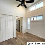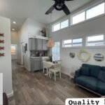 Also an RV park model tiny house. Loaded with options, this model is one of a kind. The gorgeous cedar posts, trim, and porch railing grab your attention, and you can’t stop staring. It’s breathtaking with the copper roof. The front porch is perfectly designed to accommodate larger outdoor furniture. Delivery and setup includes 2 sets of pressure-treated steps, a front porch, and a screened-in rear porch